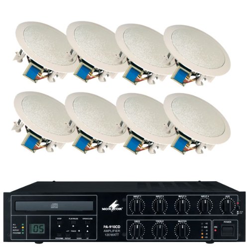 100V-Deckenlautsprecher-Kit mit acht 15w Deckenlautsprecher, 120W Verstärker mit integriertem CD-Player und 100m von schweren PA-Kabel. Ideal für Büros, in denen Hintergrundmusik und Durchsagen sind erforderlich.
